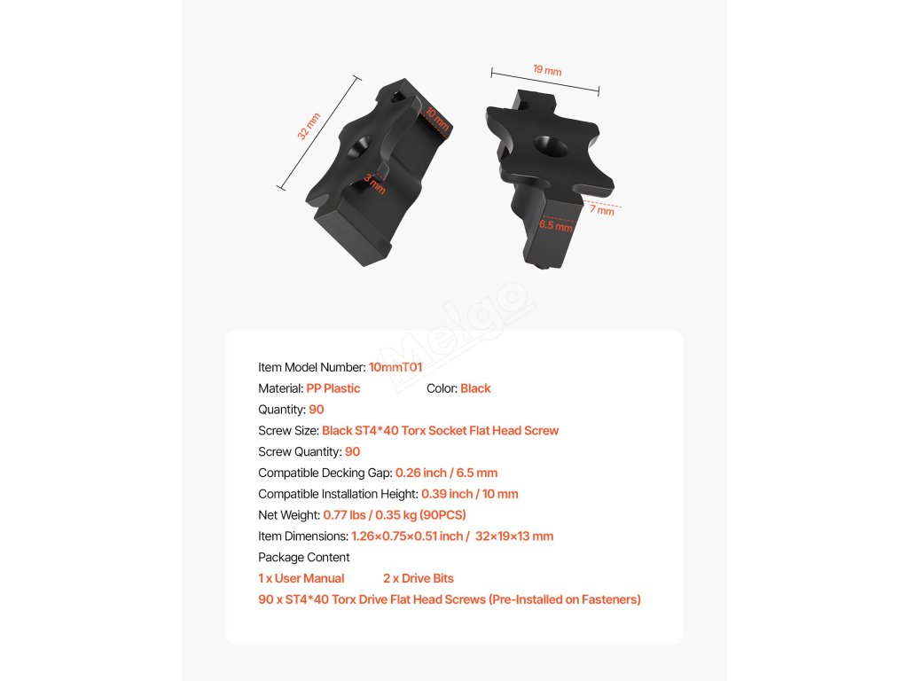 Tyto skryté upevňovací prvky pro palubu jsou vybaveny šrouby s hvězdicovým pohonem a nabízejí lepší krouticí moment, lepší přilnavost a konstrukci proti zlomení, což snižuje riziko poškození hlav šroubů nebo nástrojů.
