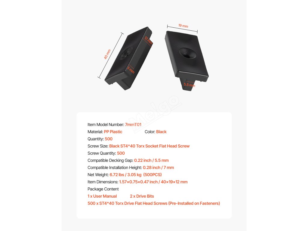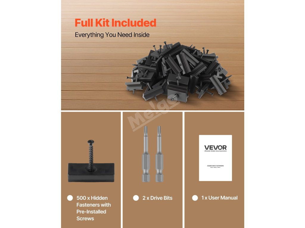 Tyto skryté upevňovací prvky pro palubu jsou vybaveny šrouby s hvězdicovým pohonem a nabízejí lepší krouticí moment, lepší přilnavost a konstrukci proti zlomení, což snižuje riziko poškození hlav šroubů nebo nástrojů.