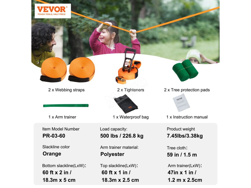 | Dolní slackline (LxW) | 60 stop x 2 palce / 18,3 m x 5 cm |