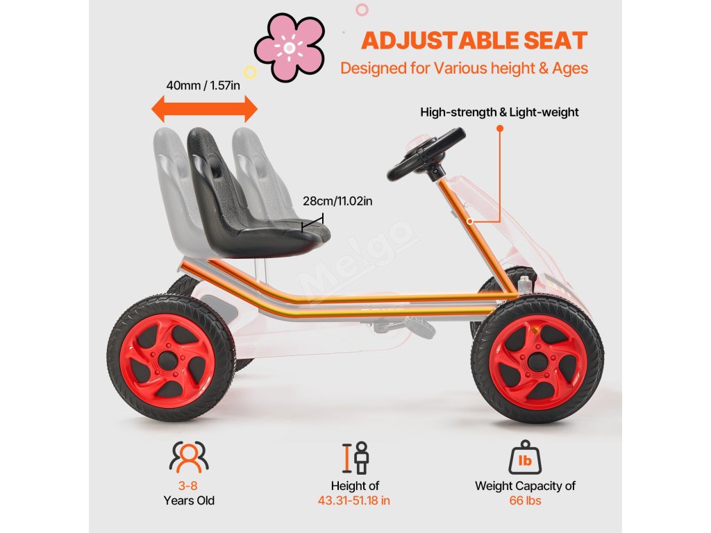 Sedadlo naší motokáry pro děti má ergonomický design, který zohledňuje růstové potřeby dětí. Díky nastavitelnému sedadlu, rámu z uhlíkové oceli a širokým pedálům si jízdu na motokáře mohou užít děti různého věku a velikosti.