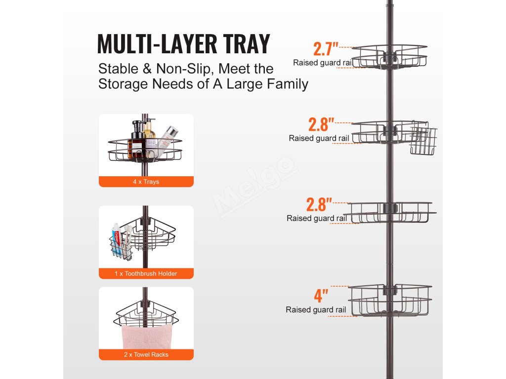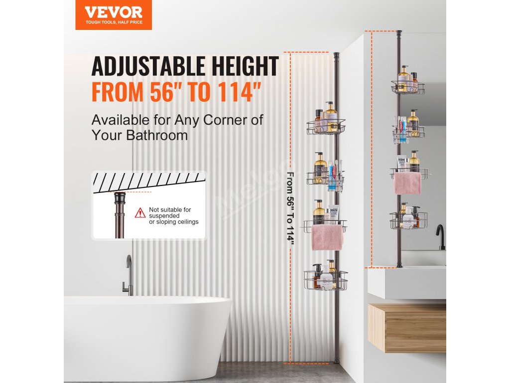 Sprchovou napínací tyč lze nastavit v rozmezí od 56" do 114". Instaluje se bez vrtání. Vyhněte se instalaci na stropy nebo šikmé střechy. Je vyrobena z nerezové oceli a je vybavena uzamykacím mechanismem. Obsahuje čtyři prostorné vaničky a jeden držák na zubní kartáčky, jeden držák na ručníky.