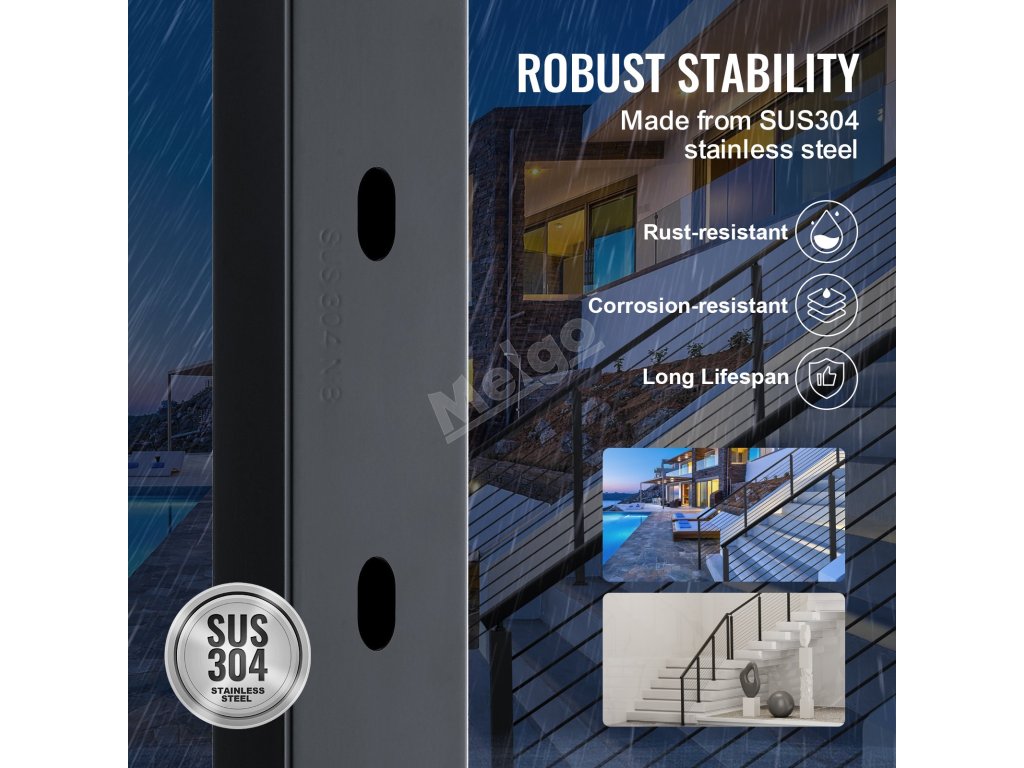 Náš sloupek kabelového zábradlí je vyroben výhradně z nerezové oceli SUS304 a má rozteč otvorů 3,14", která odpovídá stavebním normám. Díky bezešvé konstrukci bez svarů a stylové černé povrchové úpravě jsou vhodné do různých prostředí a spojují módu s funkčností.