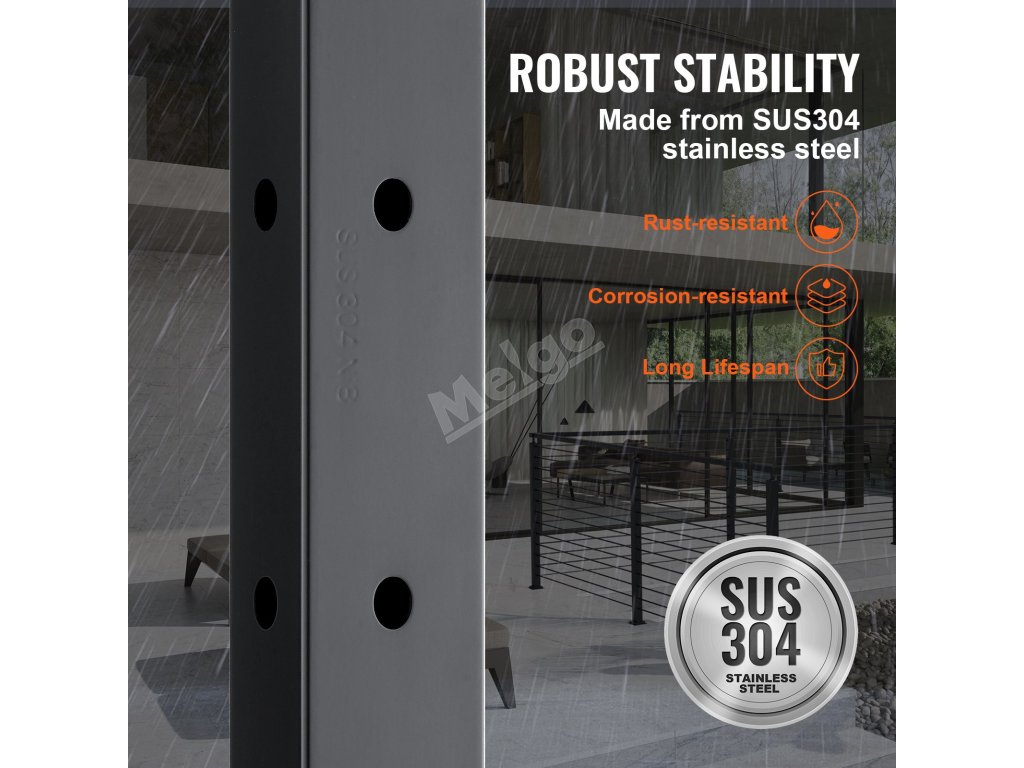 Náš sloupek kabelového zábradlí je vyroben z nerezové oceli SUS304 odolné proti korozi a rzi, což zaručuje dlouhou životnost i v náročných povětrnostních podmínkách nebo při působení korozivních látek. Nedoporučuje se však pro projekty na moři.