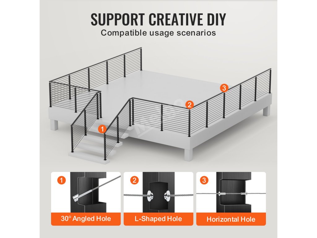 Náš sloupek kabelového zábradlí je vybaven vodorovnými i zakřivenými konzolami, které jsou kompatibilní se čtvercovými i kulatými typy zábradlí. Otvory ve tvaru L lze použít pouze pro jednosměrné úhelníky zábradlí DIY.