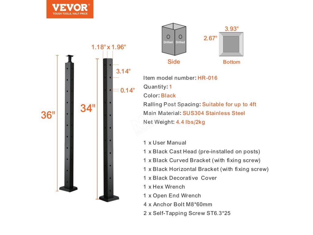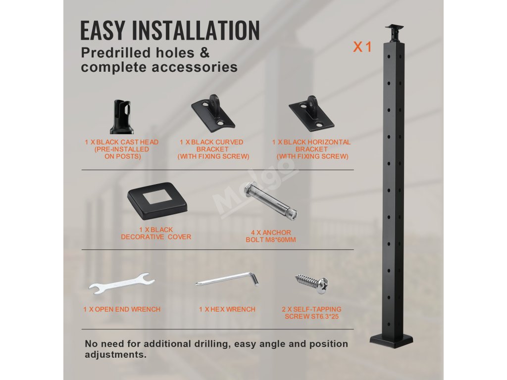 Náš rohový sloupek zábradlí se dodává s předvrtanými otvory, takže při instalaci není nutné další vrtání. Úhel a polohu můžete během instalace snadno upravit pomocí přiloženého příslušenství, což šetří práci.