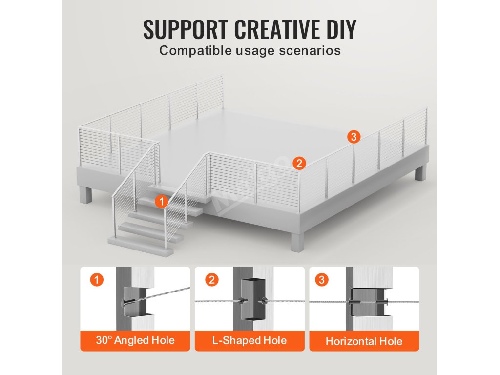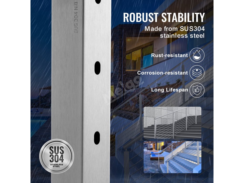 Náš sloupek kabelového zábradlí je vyroben výhradně z nerezové oceli SUS304 a má rozteč otvorů 3,14", která odpovídá stavebním normám. Díky bezešvé konstrukci bez svarů a stylovému stříbrnému provedení jsou vhodné do různých prostředí a spojují módu s funkčností.