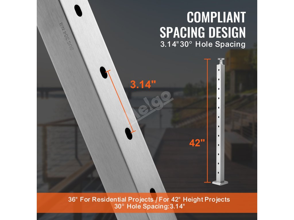 Náš 42" sloupek zábradlí s úhlovým otvorem 30° má oválné otvory 0,41"-0,59" s roztečí 3,14" mezi jednotlivými otvory, které prošly 4" kuličkovým testem. Ideální pro ochranu vaší rodiny na schodech s úhlem 25° až 35°, čímž je zajištěna jejich bezpečnost.