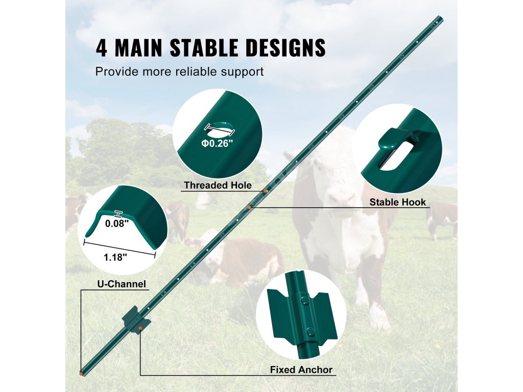 Tento plotový sloupek je vyroben z vysoce kvalitní uhlíkové oceli Q235 o tloušťce 2 mm a je konstruován s ohledem na pevnost a trvanlivost, odolává deformacím a poskytuje vynikající nosnost a oporu. Je ideální pro různé potřeby venkovního oplocení, které ochrání vaši farmu, zahradu nebo dvůr po dlouhá léta bez poškození.