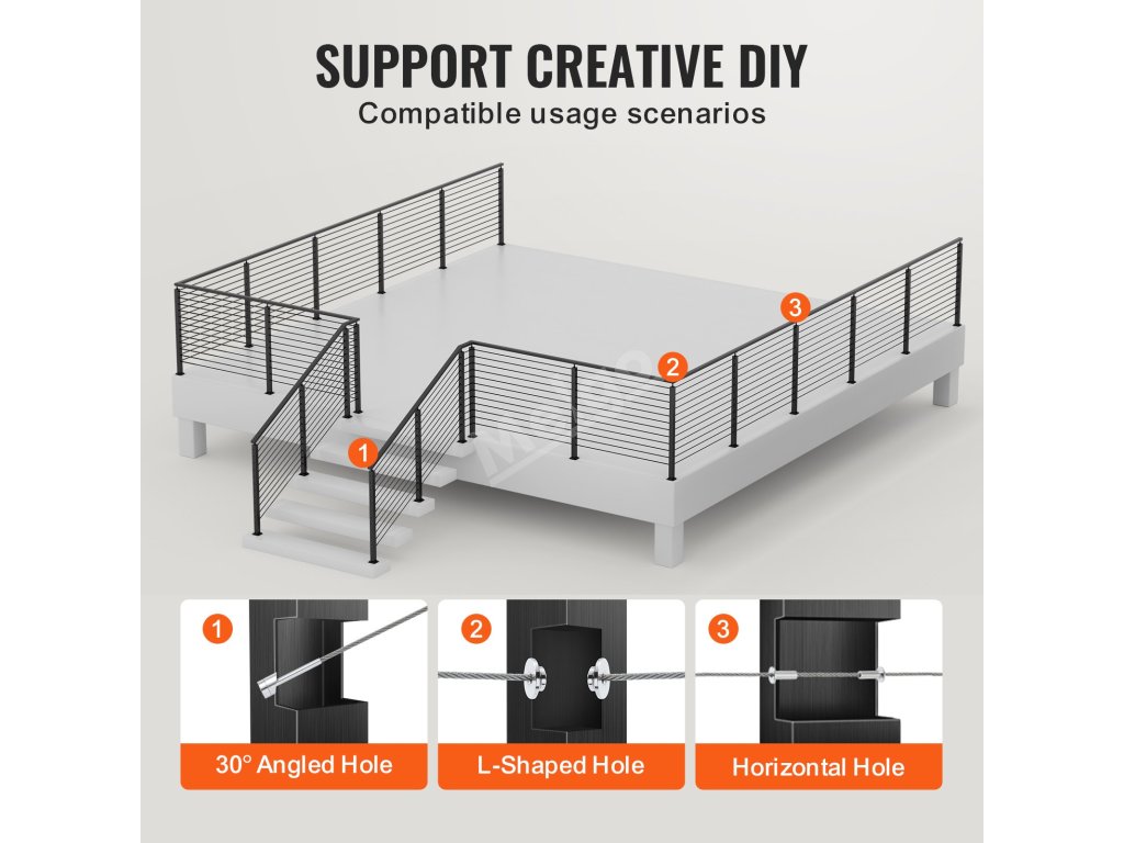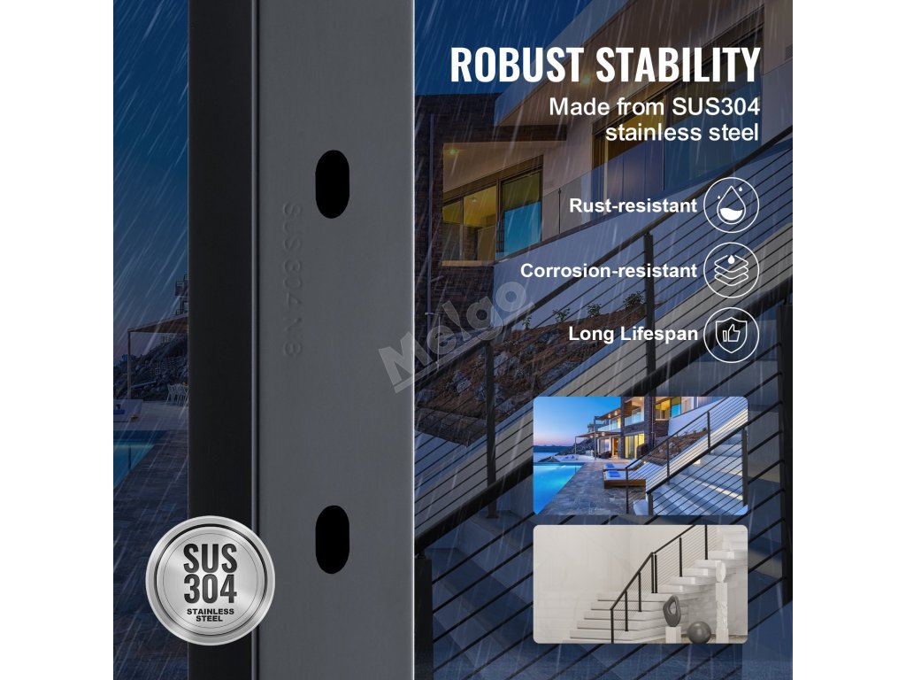 Náš sloupek kabelového zábradlí je vyroben výhradně z nerezové oceli SUS304 a má rozteč otvorů 3,14", která odpovídá stavebním normám. Díky bezešvé konstrukci bez svarů a stylové černé povrchové úpravě jsou vhodné do různých prostředí a spojují módu s funkčností.