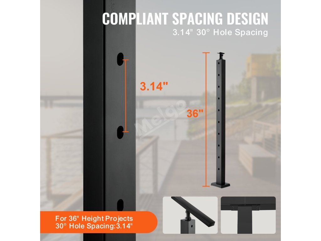 Náš 36" sloupek zábradlí s úhlovým otvorem 30° má oválné otvory 0,31"-0,51" s roztečí 3,14" mezi jednotlivými otvory, které prošly 4" kuličkovým testem. Ideální pro ochranu vaší rodiny na schodech s úhlem 25° až 35°, čímž je zajištěna jejich bezpečnost.