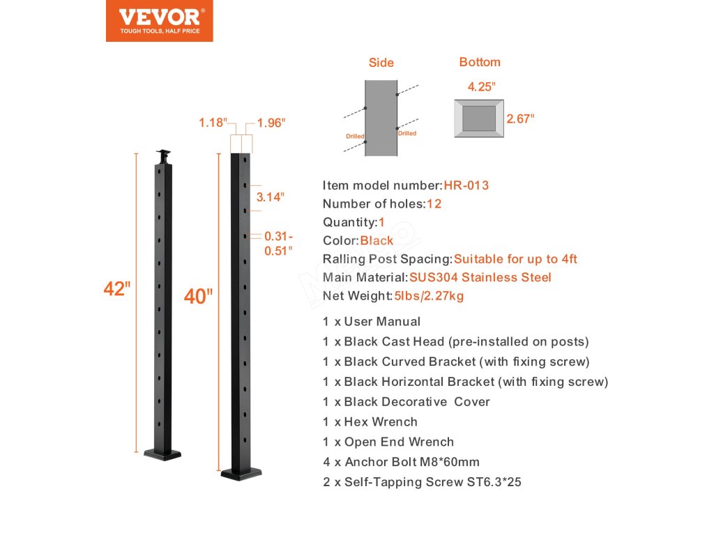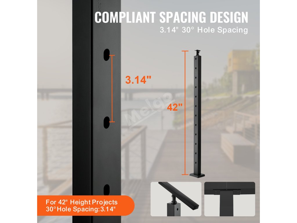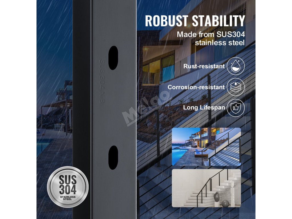 Náš sloupek kabelového zábradlí je vyroben výhradně z nerezové oceli SUS304 a má rozteč otvorů 3,14", která odpovídá stavebním normám. Díky bezešvé konstrukci bez svarů a stylové černé povrchové úpravě jsou vhodné do různých prostředí a spojují módu s funkčností.