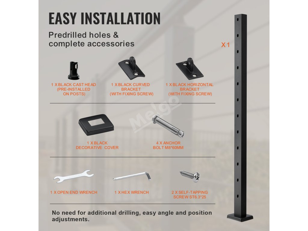 Náš sloupek schodišťového zábradlí se dodává s předvrtanými otvory, takže při instalaci není nutné další vrtání. Úhel a polohu můžete během instalace snadno upravit pomocí přiloženého příslušenství, což vám ušetří práci.