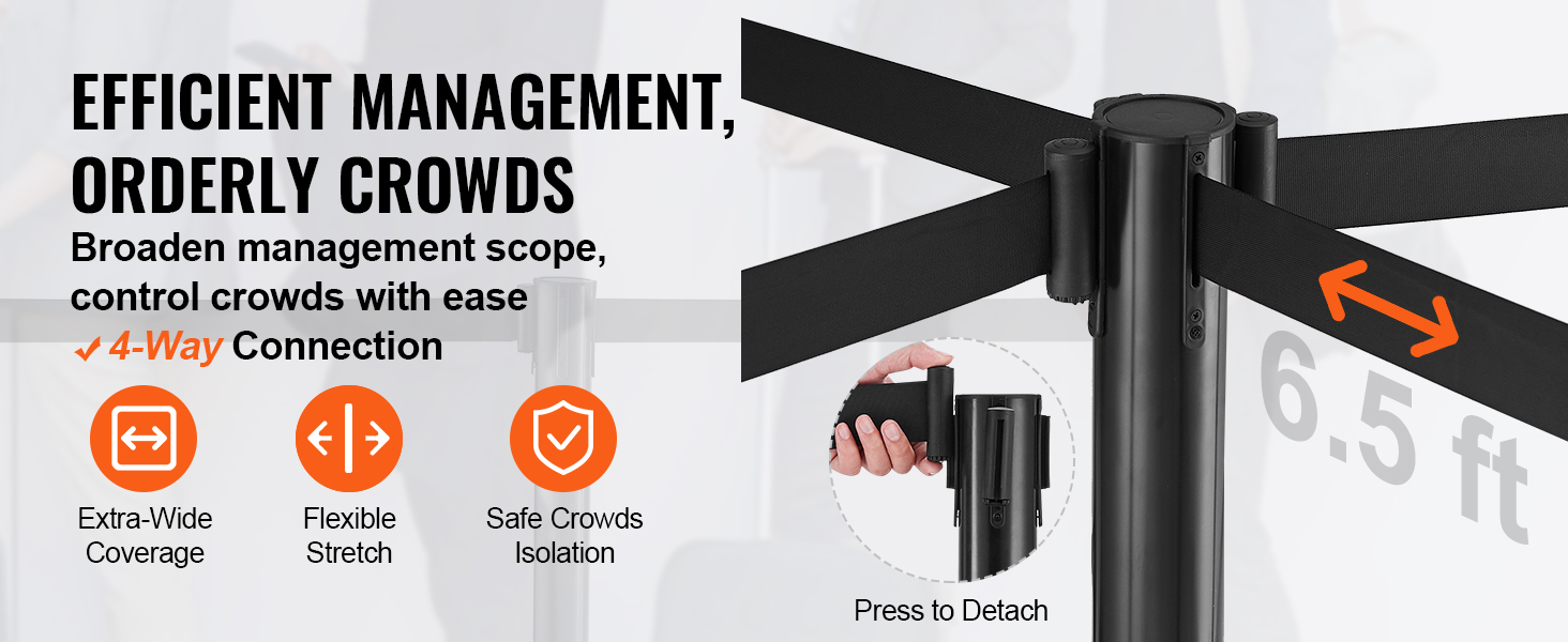 Zažijte bezkonkurenční účinnost kontroly davu díky 3 x 6,5FT polyesterovým zatahovacím pásům, které vám umožní bez námahy zvládat davy a rozšířit rozsah kontroly. Přidání čtyřcestného adaptéru zvyšuje pohodlí a umožňuje flexibilní nastavení pro organizovanou kontrolu davu.