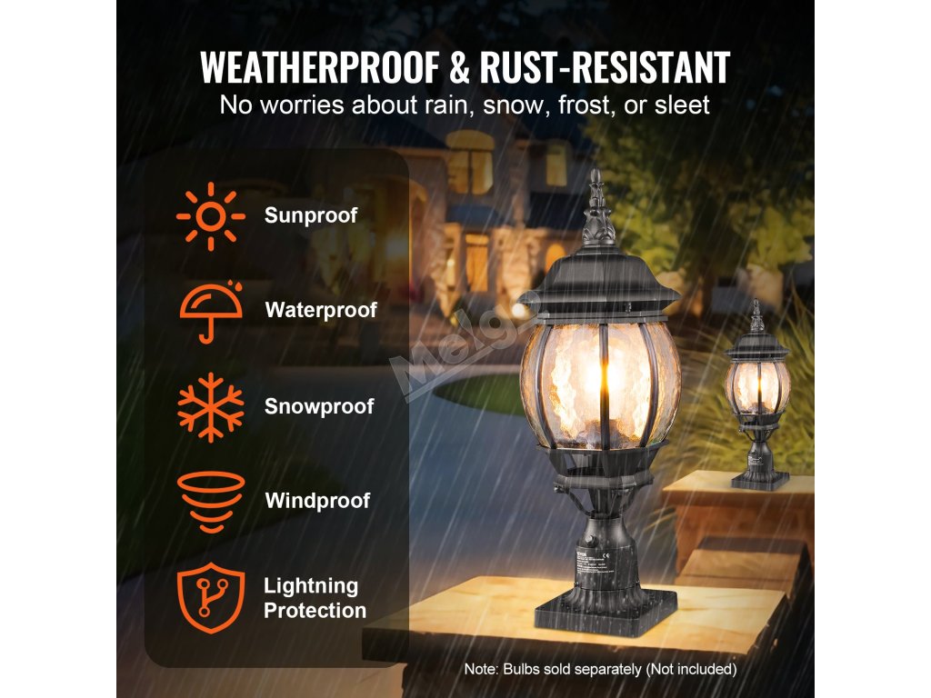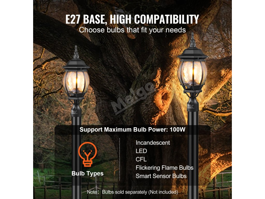 Naše venkovní sloupkové světlo je kompatibilní se všemi žárovkami s paticí E27 včetně žárovek, LED, CFL, žárovek s blikavým světlem a žárovek s inteligentním senzorem (žárovky se prodávají samostatně, nejsou součástí dodávky). Umožňuje přizpůsobit osvětlení vašim potřebám a preferencím.