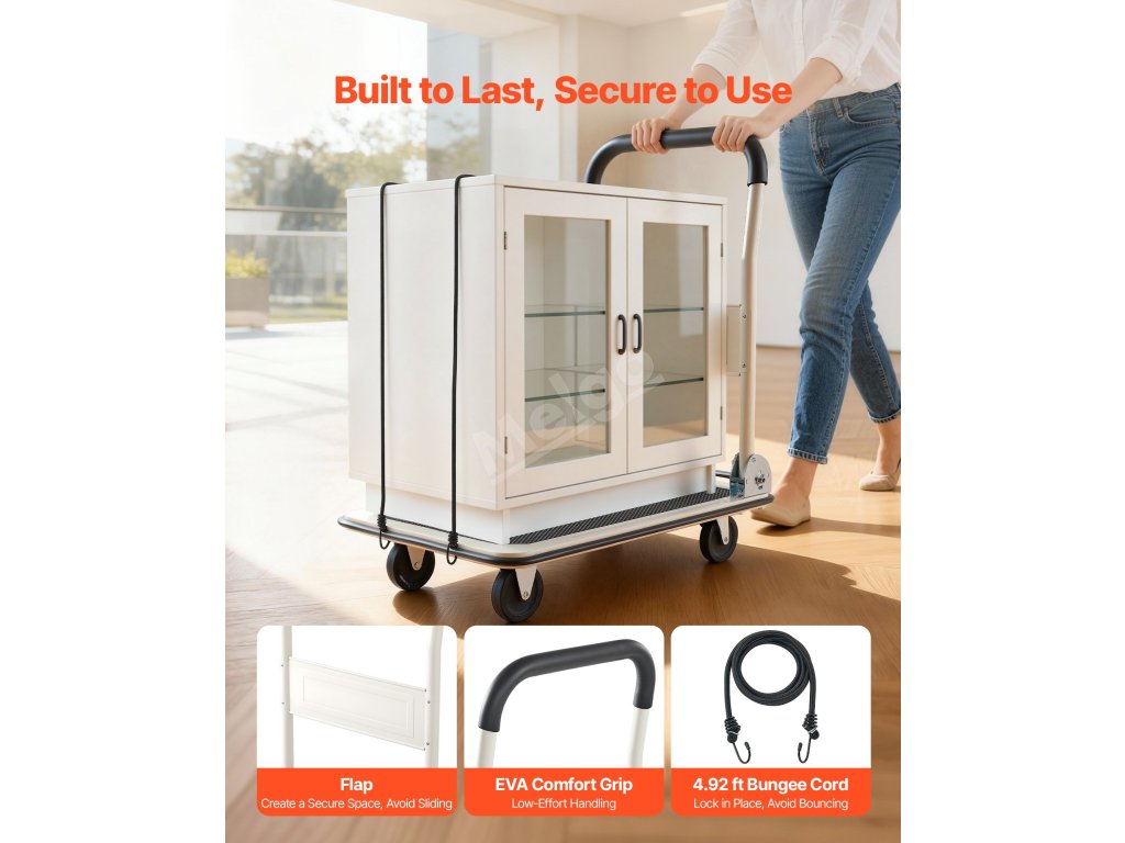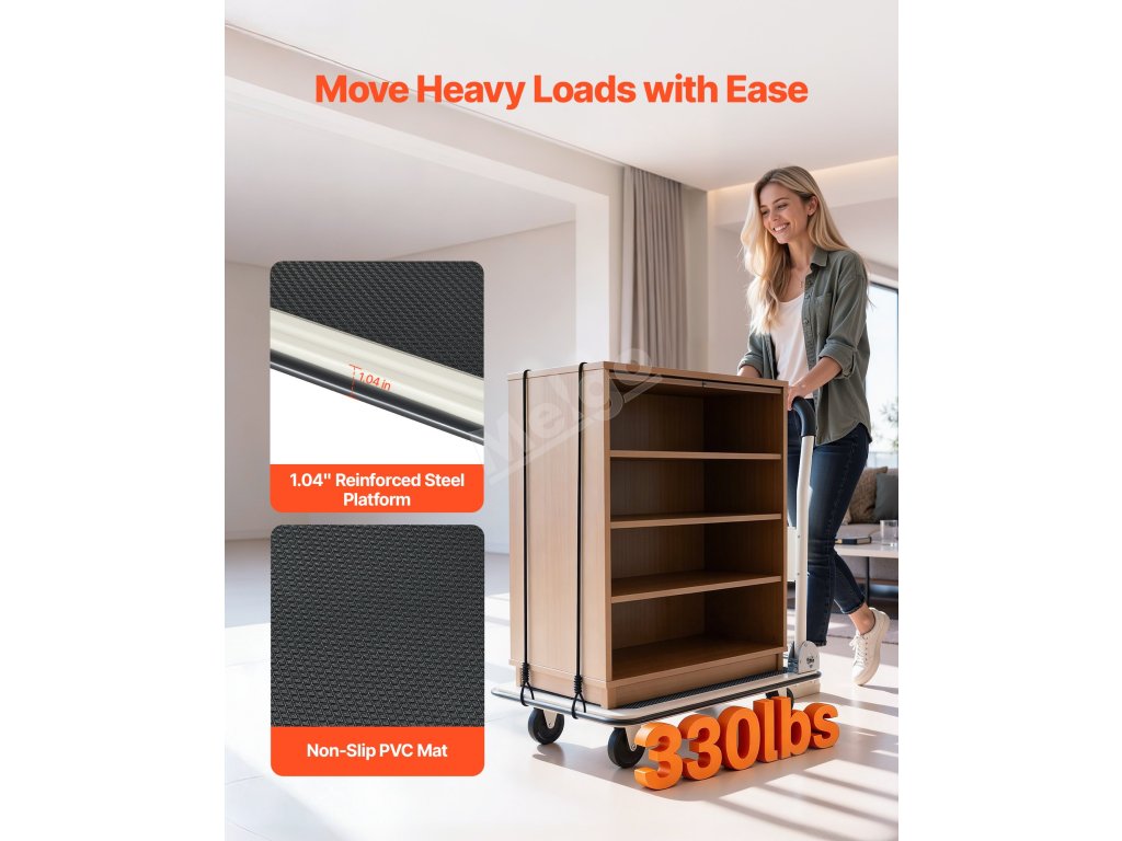 Tento skládací plošinový vozík je vyroben ze zesíleného rámu z legované oceli a nabízí dlouhou životnost. Odolává ohýbání při velkém zatížení, je ideální pro přemisťování těžkých předmětů v domácnosti nebo skladování zboží v malých obchodech, aniž by se deformoval.