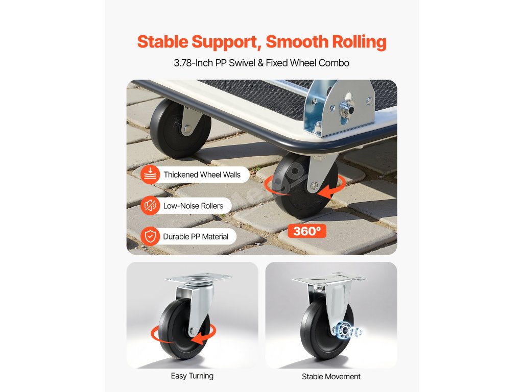 Díky velkým otočným a robustním kolečkům se tento skládací vozík s plochou ložnou plochou hladce pohybuje a snadno se otáčí. Zůstává stabilní na různých površích v interiéru i exteriéru.