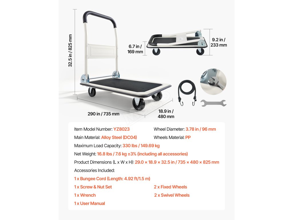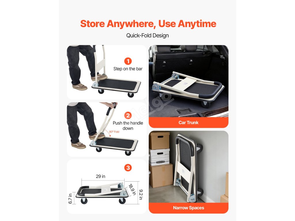 Rozlučte se s objemnými vozíky, které zabírají spoustu místa. Tento pojízdný plošinový vozík se rychle složí a vejde se na balkon, do rohu obchodu nebo do kufru auta, čímž šetří místo a zároveň je připraven k použití.