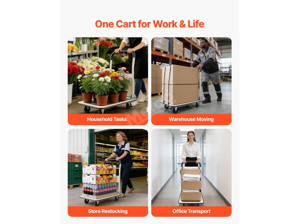 Tento skládací vozík s rovnou ložnou plochou a kolečky zvládne vše - od domácích prací přes doplňování zásob v obchodě až po stěhování kancelářského vybavení. Jeden vozík zvládne více úkolů s menší námahou.