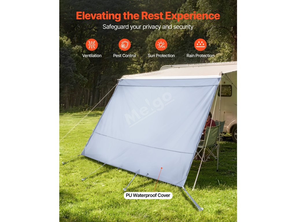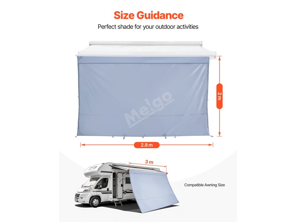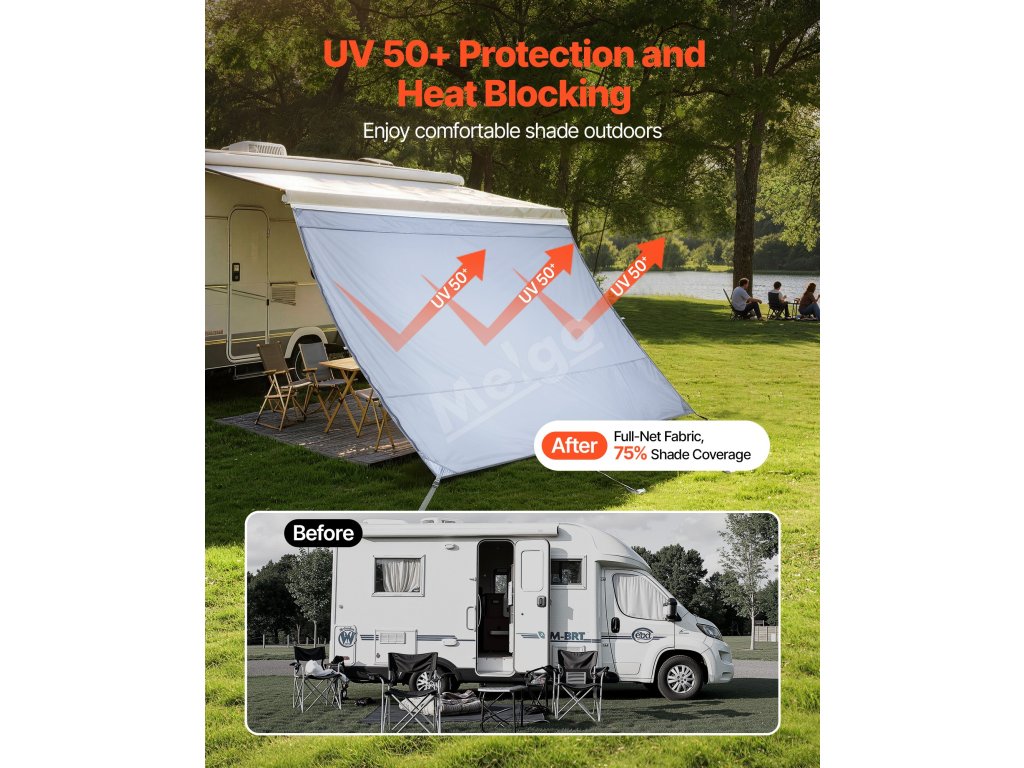 Vytvořte si pohodlnější venkovní prostor ve stínu pro kempování v karavanu tím, že zablokujete přímé sluneční světlo a snížíte zahřívání, přičemž zachováte dobré proudění vzduchu, aby byly vaše venkovní aktivity příjemnější. Rozměry stínidla: 2 x 2,8 m, kompatibilní s 3 m dlouhými markýzami.