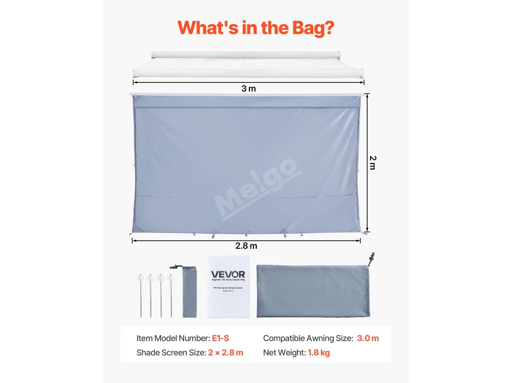Součástí balení je sluneční clona pro markýzu na karavan s krytem UV50+, 4 kolíky do země, uživatelská příručka, taška na uložení kolíků do země a taška na uložení sluneční clony pro snadnou přepravu a organizaci.