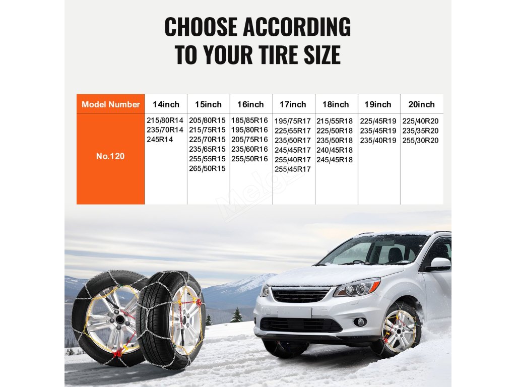 Naše sněhové řetězy jsou určeny pro osobní automobily, vozy SUV a nákladní automobily. Změřte šířku svých pneumatik, abyste zajistili správné nasazení a zajistili co nejtěsnější utažení sněhových řetězů pro bezpečnost a trvanlivost.