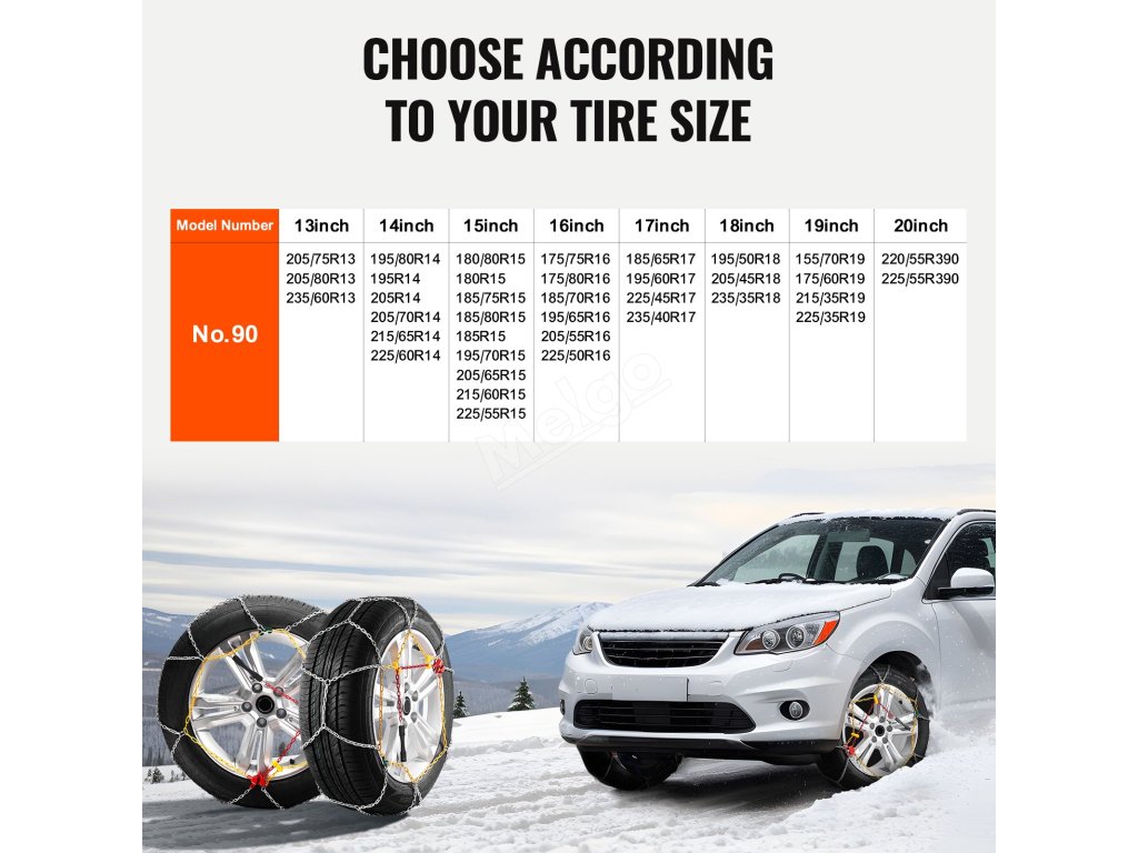 Naše sněhové řetězy jsou určeny pro osobní automobily, vozy SUV a nákladní automobily. Změřte šířku svých pneumatik, abyste zajistili správné nasazení a zajistili co nejtěsnější utažení sněhových řetězů pro bezpečnost a trvanlivost.