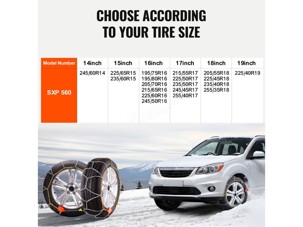 Naše sněhové řetězy jsou určeny pro osobní automobily, vozy SUV a nákladní automobily. Změřte šířku svých pneumatik, abyste zajistili správné nasazení a zajistili co nejtěsnější utažení sněhových řetězů pro bezpečnost a trvanlivost.