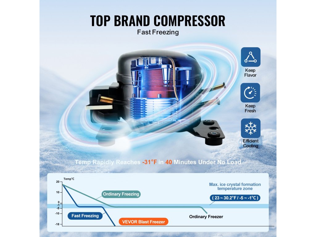 Chladnička je vybavena výkonným kompresorem a 360° cirkulací studeného vzduchu, horké potraviny lze rychle snížit ze 194℉/90 ℃ na 37,4℉/3 ℃ během 90 minut a režim rychlého zmrazení dokáže rychle snížit teplotu ze 194℉/90 ℃ na -0,4℉/-18 ℃ během 240 minut.