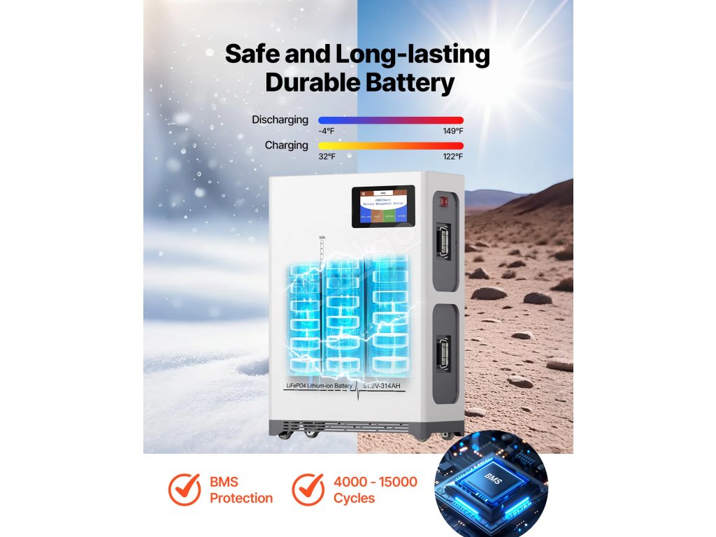 Vysoce kvalitní baterie LiFePO₄ podporuje 4000-15 000 hlubokých nabíjecích cyklů. Vestavěný systém BMS zajišťuje inteligentní ochranu a stabilní výstup, čímž poskytuje trvalý výkon pro aplikace mimo síť.