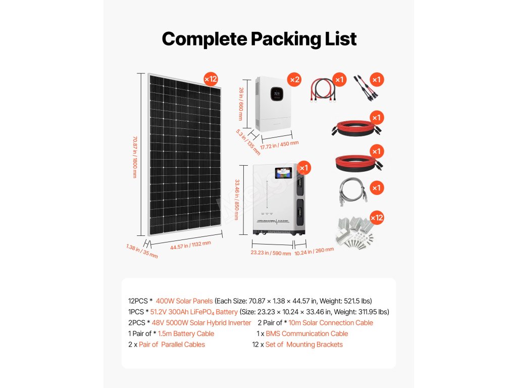 Tato sada solární energie obsahuje 12 ks 400W solárních panelů, 51,2V 300Ah LiFePO₄ baterii a 2 ks 48V 5000W hybridního solárního střídače. Díky kapacitě až 19200Wh/den a baterii 15360Wh poskytuje extrémně vysoký výkon pro efektivní napájení velkých domů, kůlen, farem a spotřebičů s vysokou spotřebou.