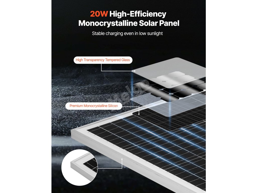 Rozlučte se s vybitými bateriemi! Naše 20W 12V solární nabíječka baterií využívá sluneční energii ke spolehlivému napájení 12V baterií. Je navržena s vysoce účinnými monokrystalickými solárními články a poskytuje spolehlivé nabíjení a údržbu pro automobily, obytné vozy, lodě a další