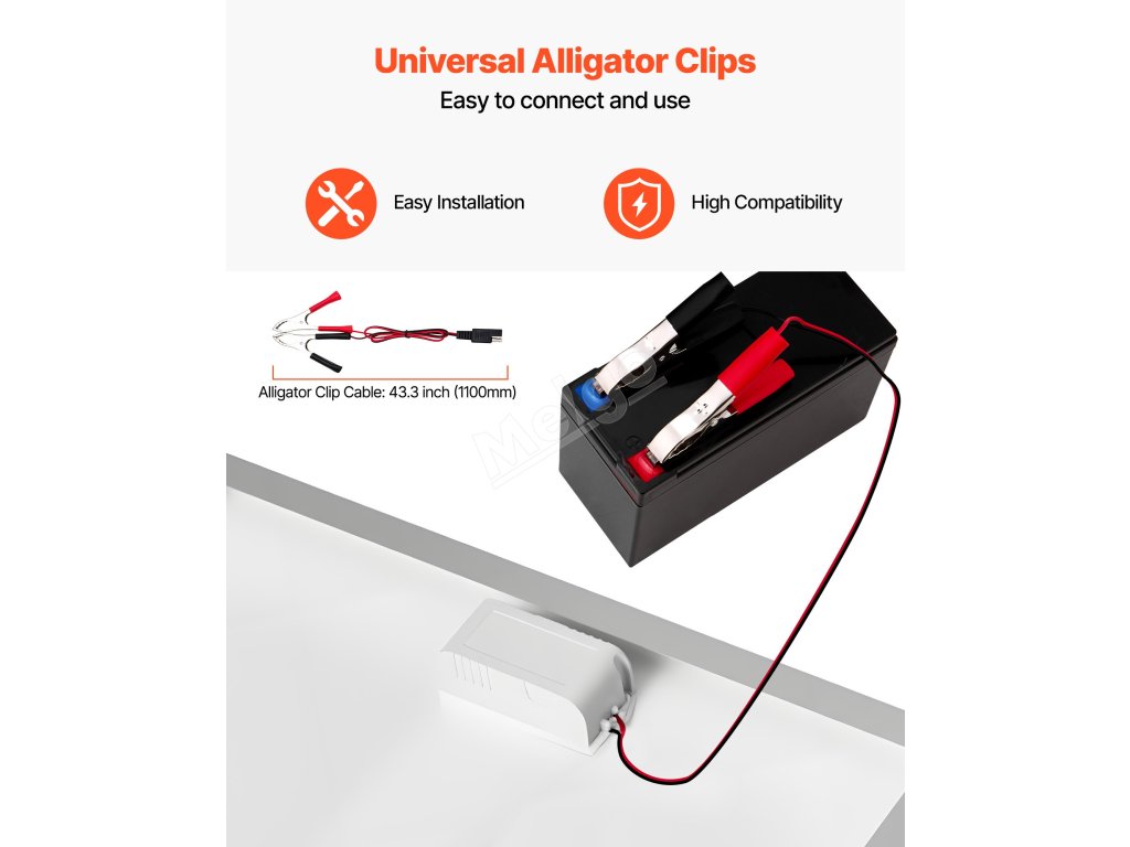 Tato nabíječka baterií se solárním panelem se dodává s prodlužovacím kabelem o délce 122 palců a 43,3palcovými krokosvorkami. Pro rychlé nabití stačí připojit k 12voltové baterii.