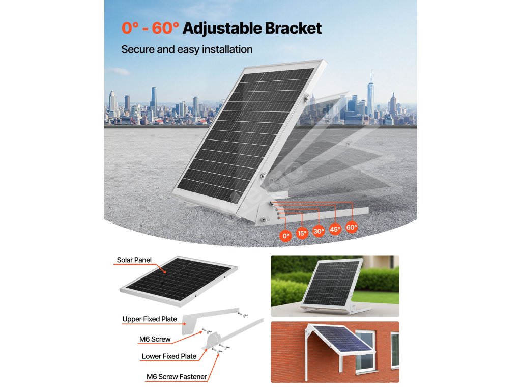 Tato sada pro nabíjení baterií solárním panelem je vybavena nastavitelným úhlem 0°-60°, šrouby M6 a předvrtanými otvory pro bezpečnou dlouhodobou instalaci na stěny, paluby lodí, střechy automobilů, střechy domů a další místa, aby vaše zařízení bylo neustále napájeno.