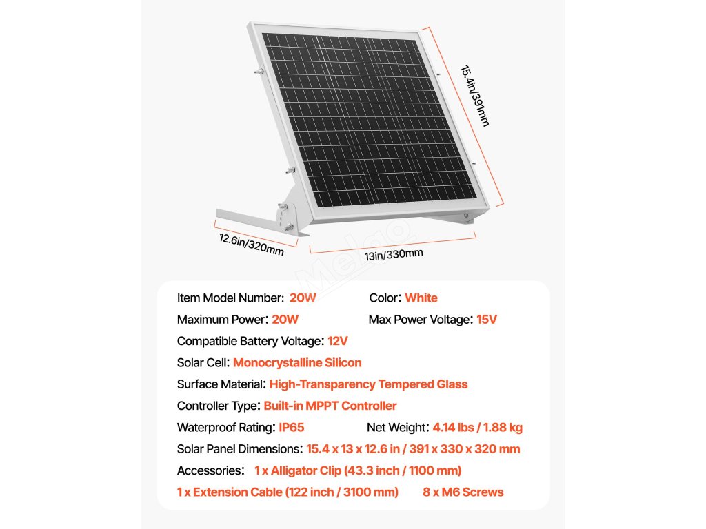 | Rozměry solárního panelu | 15.4 x 13 x 12,6 palce / 391 x 330 x 320 mm |