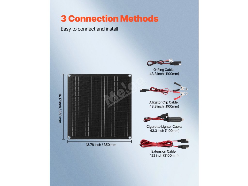 Je vybaven třemi možnostmi připojení: 43,3palcovými (1,1 m) krokosvorkami, 43,3palcovými (1,1 m) O-kroužkovými svorkami a 43,3palcovou (1,1 m) zástrčkou do zapalovače cigaret, jakož i 122palcovým (3,1 m) prodlužovacím kabelem, který nabízí rychlé připojení pro spolehlivé nabíjení.