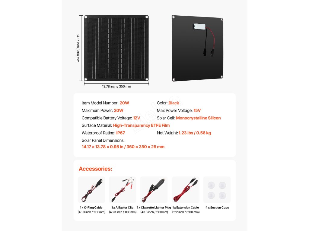 | Rozměry solárního panelu | 14.17 x 13,78 x 0,98 palce / 360 x 350 x 25 mm |