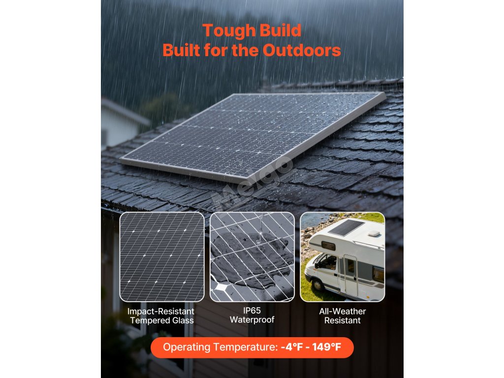 Tento solární panel má odolný hliníkový rám, takže je ideální pro dlouhodobou instalaci na ploché střechy, střechy domů, farmy, dvory nebo obytné vozy a zároveň poskytuje stálou a spolehlivou energii. (Montážní držáky NEJSOU součástí dodávky)