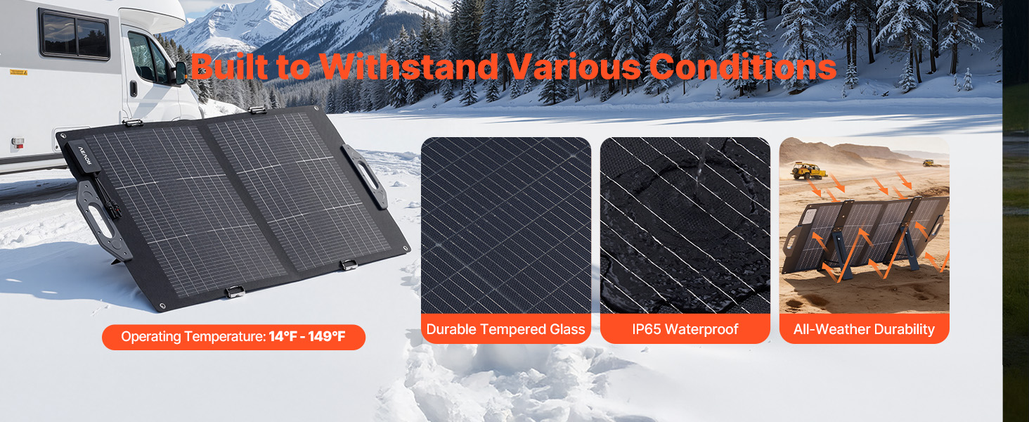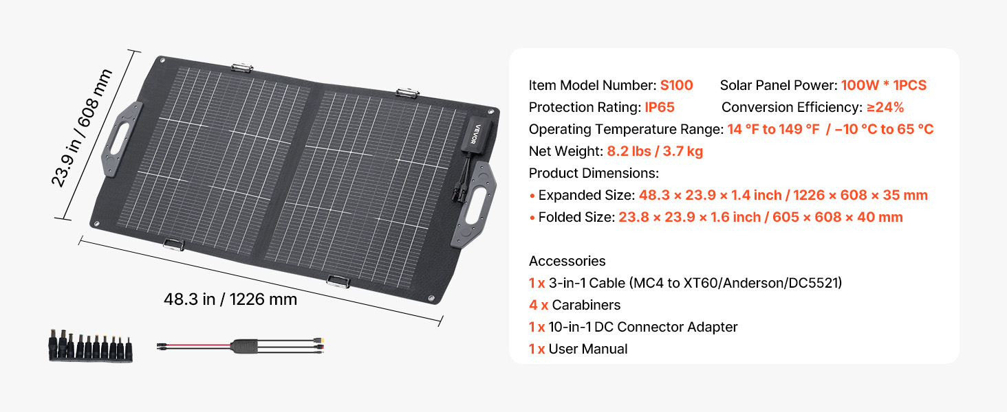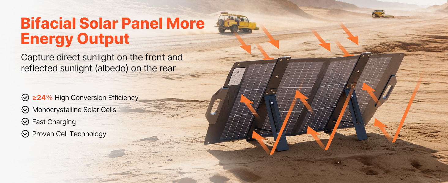 Napájejte svá venkovní dobrodružství pomocí našeho 100W oboustranného skládacího solárního panelu. Je vybaven monokrystalickými články s vysokou účinností a ≥24% účinností konverze, takže poskytuje spolehlivou energii pro rychlé nabíjení vašich zařízení - nezbytný společník pro kempování, obytné vozy, turistiku a rybaření.
