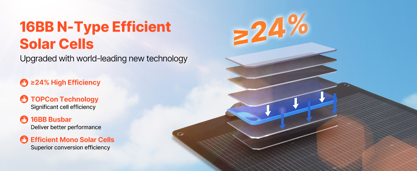 Díky vysoce účinným monokrystalickým solárním článkům typu N 16BB a účinnosti konverze ≥ 24 % tento solární panel zachycuje více slunečního světla a poskytuje stabilní a konzistentní výstup energie, aby vaše zařízení byla neustále napájena.