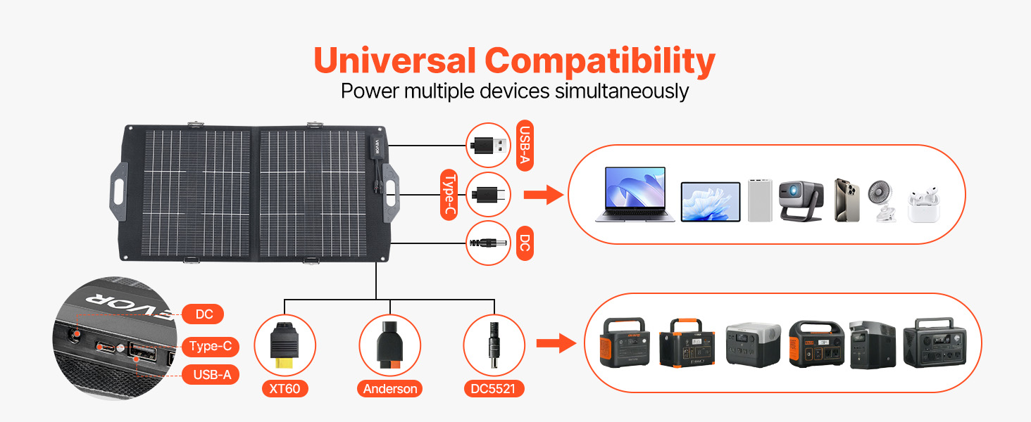 Je vybaven 2 porty USB-A (QC 3.0), 1 portem typu C a 1 portem DC pro současné nabíjení více zařízení. Součástí je také integrovaný kabel MC4, kabel s konektorem MC4 3 v 1 (MC4 na XT60/Anderson/DC5521) a adaptér s konektorem DC 10 v 1, kompatibilní s většinou napájecích zařízení.