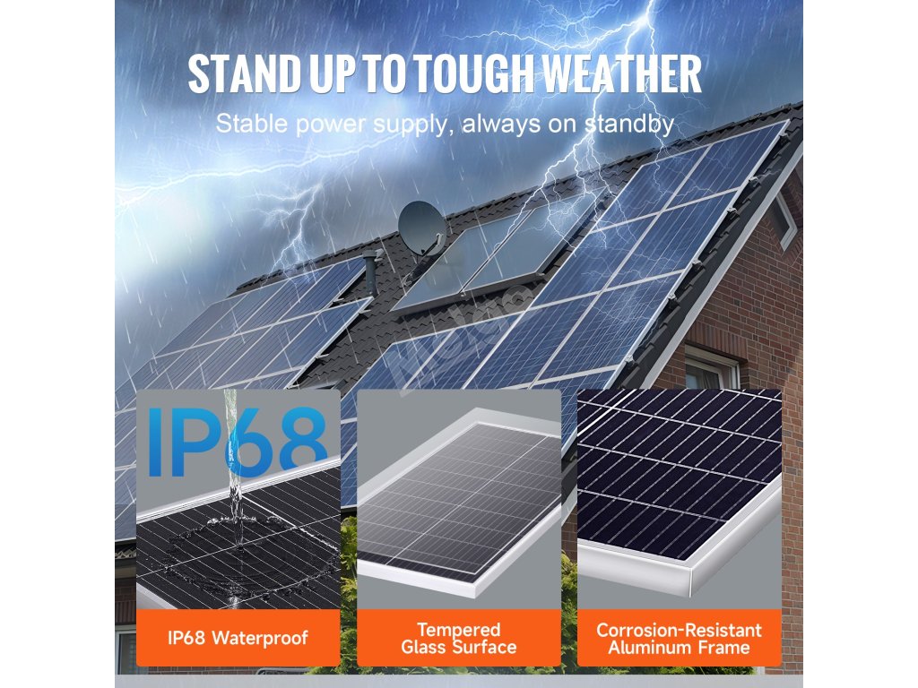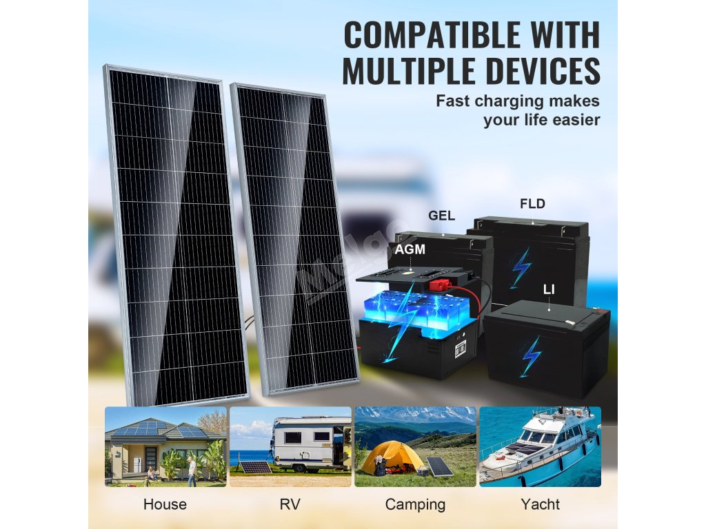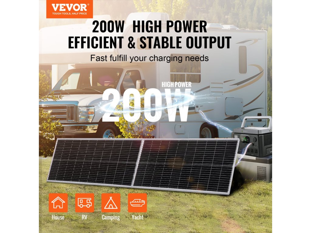 Zlepšete svůj životní styl s monokrystalickými solárními panely VEVOR 2ks x 100W + regulátor nabíjení. Díky monokrystalickým solárním článkům a vysoké míře konverze energie přes 23 % napájí vaše zařízení od domácnosti, obytného vozu, jachty až po kempování, kompatibilní s různými bateriemi AGM, GEL, FLD a LI.