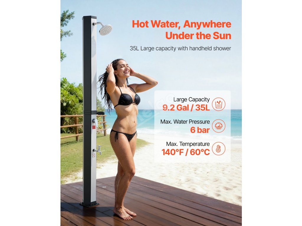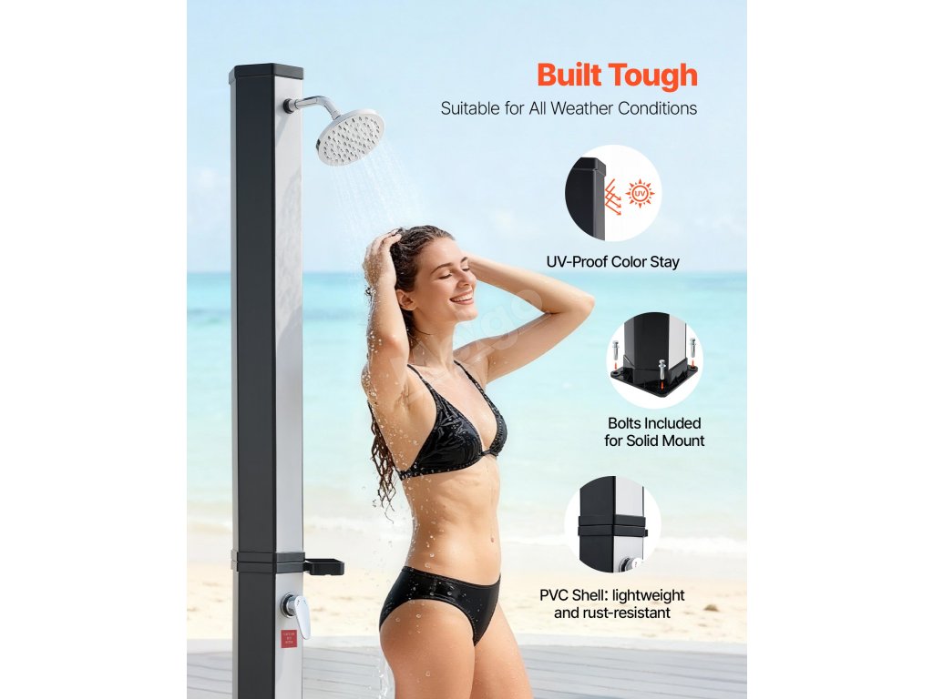 Solárně ohřívaná voda poskytuje stálý proud pro oplachování před koupáním nebo po něm. Ideální pro použití v teplém počasí - nevhodné pro chladné roční období.