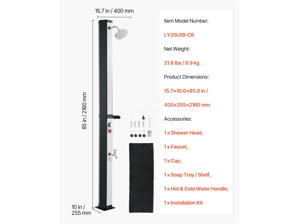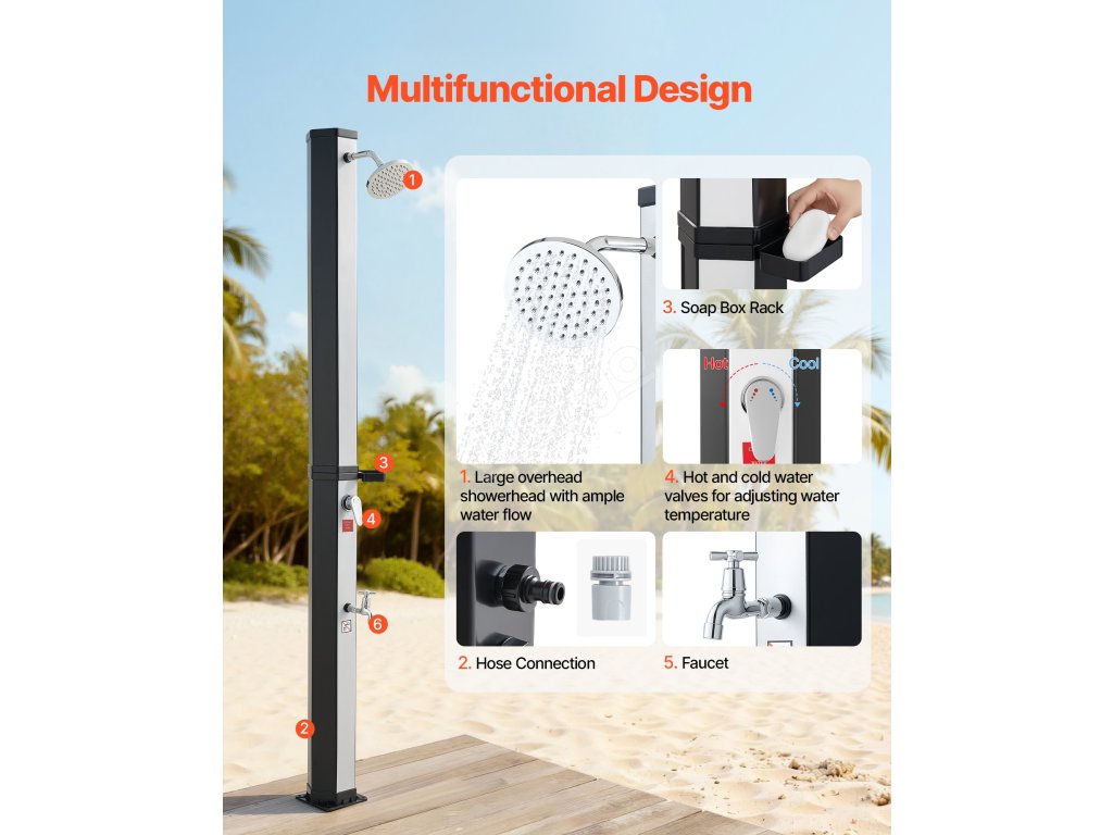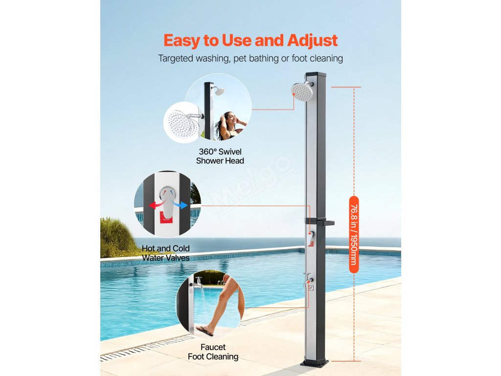 Smíchejte horkou a studenou vodu, abyste dosáhli požadovaného nastavení. Součástí je odnímatelný ruční postřikovač a základna pro oplachování nohou. Voda se může na prudkém slunci ohřát až na 60 °C/140 °F.
