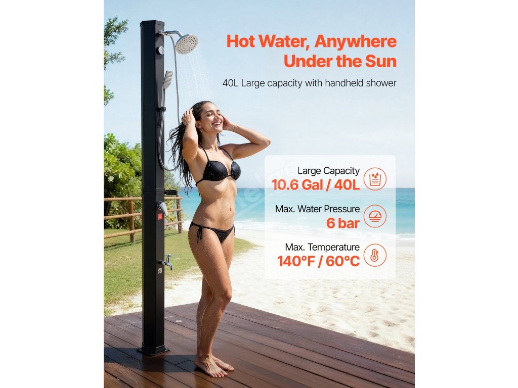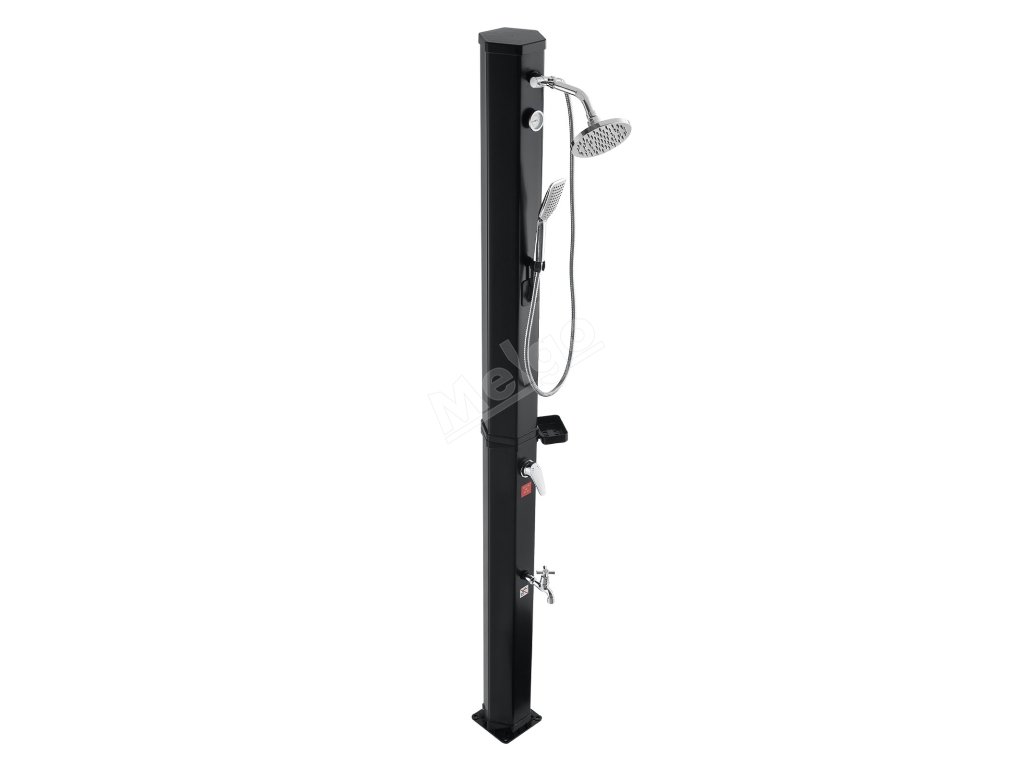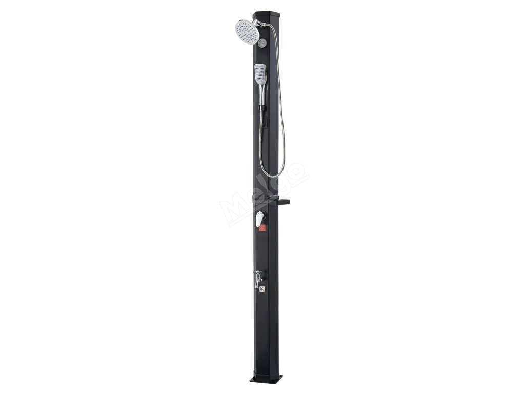 Solárně ohřívaná voda poskytuje stálý průtok pro oplachování před koupáním nebo po něm. Ideální pro použití v teplém počasí - nevhodné pro chladné roční období.
