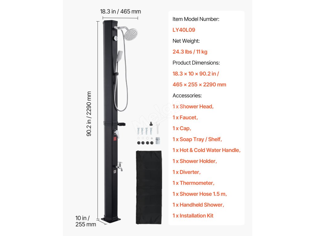 Smíchejte horkou a studenou vodu, abyste dosáhli požadovaného nastavení. Součástí je odnímatelná základna pro stříkání rukou a oplachování nohou. Voda se může na prudkém slunci ohřát až na 60 °C/140 °F.