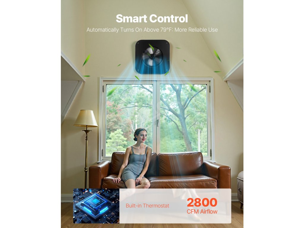 Ventilátor je vybavený zabudovaným termostatom, ktorý sa automaticky spustí, keď teplota v podkroví prekročí nastavenú hodnotu, čím pomáha znižovať teplotu v interiéri a udržiavať príjemné podmienky na bývanie.