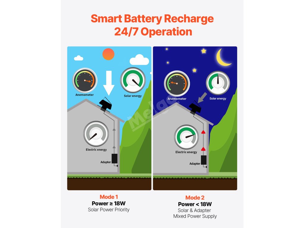 Keď je solárna energia nedostatočná, inteligentný napájací adaptér automaticky dopĺňa batériu, čím zabezpečuje nepretržitú prevádzku ventilátora. Dodáva sa aj s bezdrôtovým diaľkovým ovládaním, ktoré umožňuje používateľom pohodlne ovládať funkciu zapnutia/vypnutia ventilátora na diaľku.