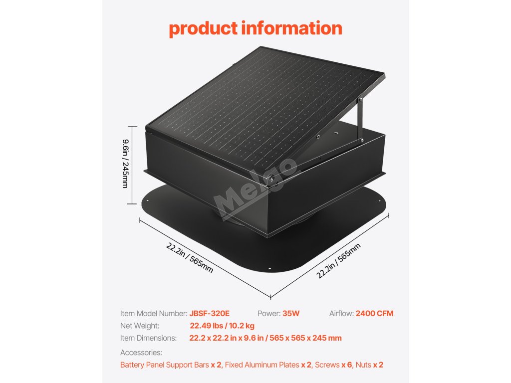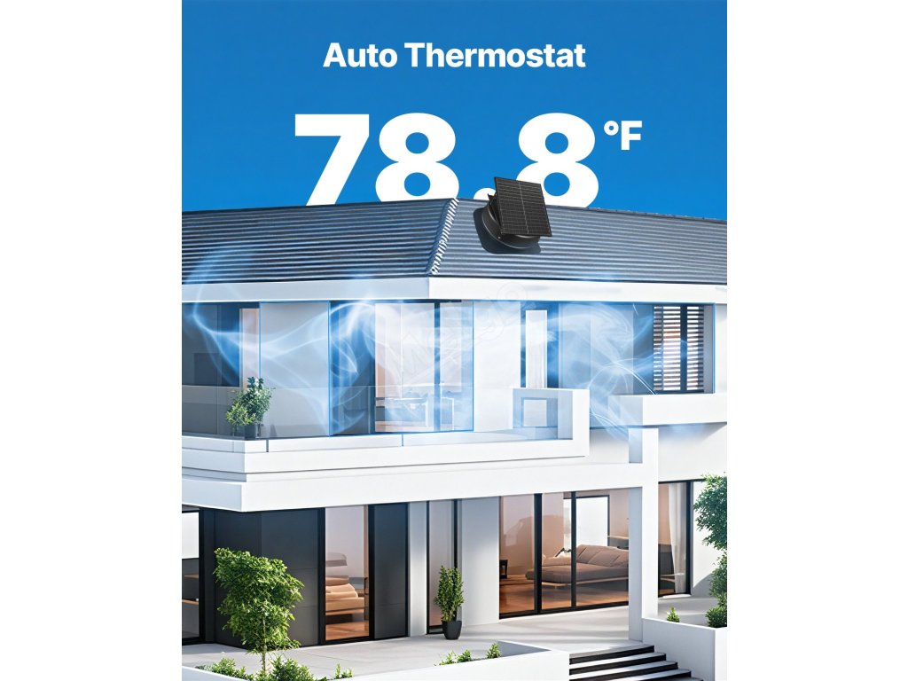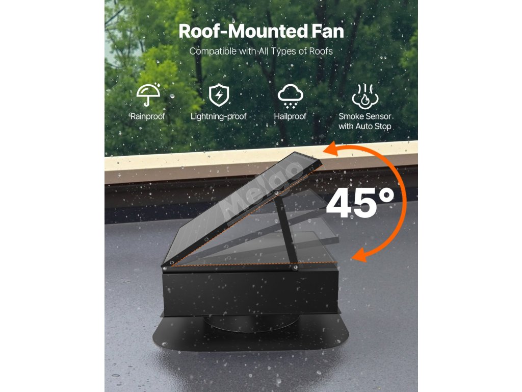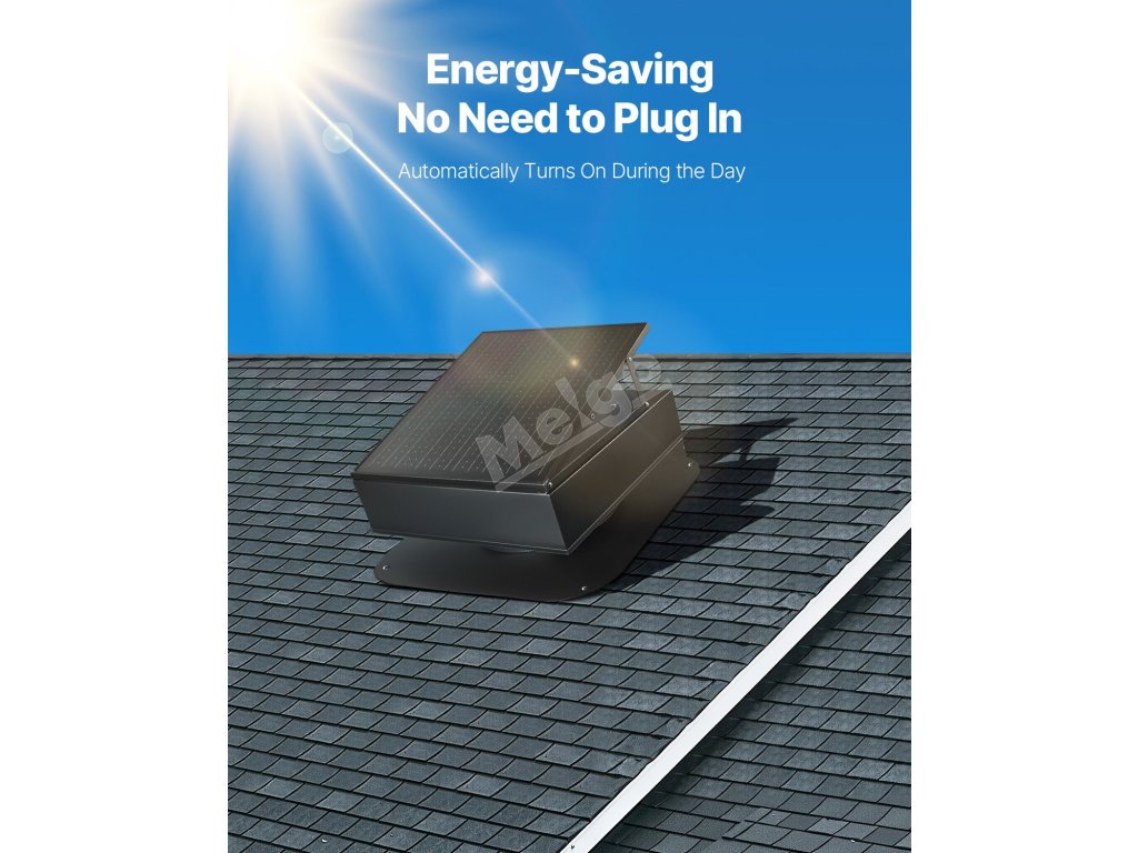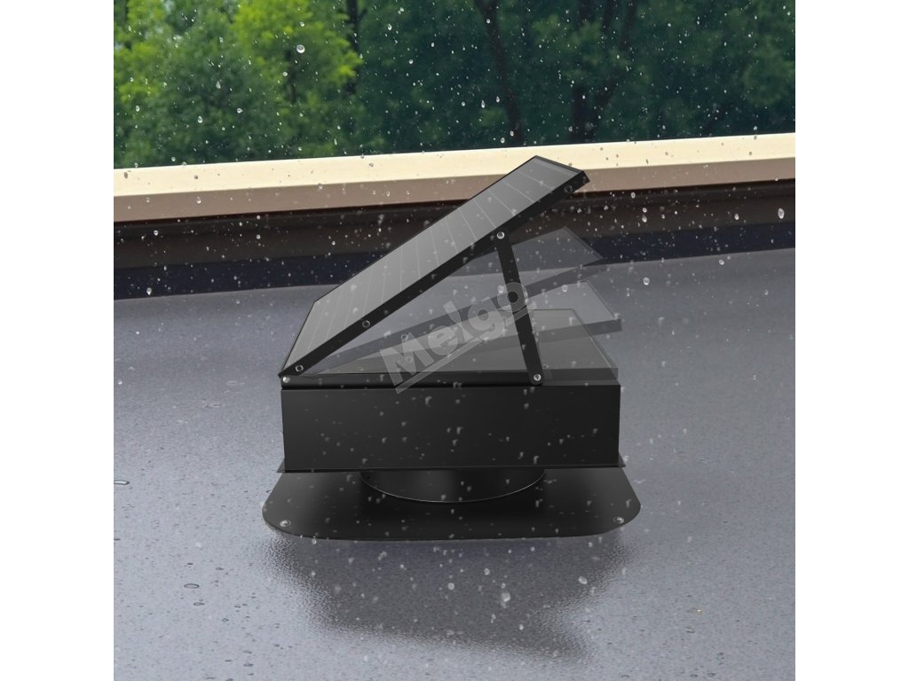 Tento solárny strešný ventilátor je vybavený účinným monokryštalickým kremíkovým panelom, nepotrebuje externé napájanie a je energeticky úsporný. Vďaka nastaviteľnému uhlovému panelu maximalizuje pôsobenie slnečného svetla. Je skonštruovaný tak, aby odolával krupobitiu, bleskom a poveternostným vplyvom, je odolný v akýchkoľvek podmienkach.