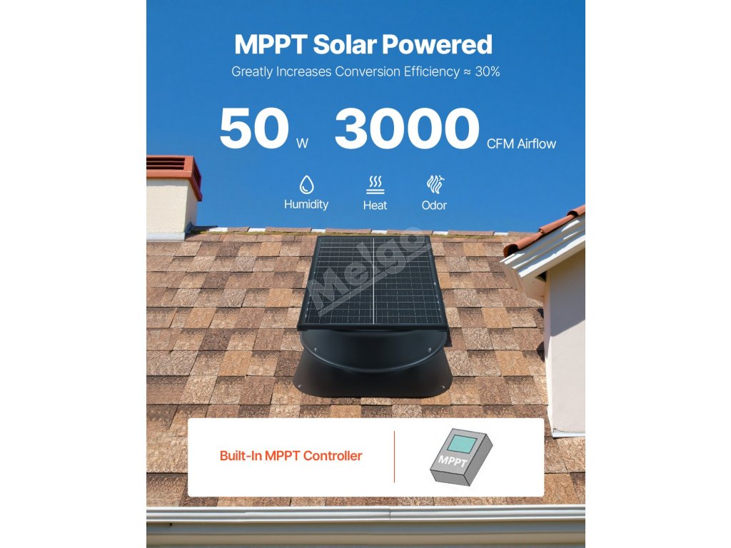 Tento solárny strešný ventilátor je vybavený účinným monokryštalickým kremíkovým panelom, nepotrebuje externé napájanie a je energeticky úsporný. Vďaka nastaviteľnému uhlovému panelu maximalizuje pôsobenie slnečného svetla. Je skonštruovaný tak, aby odolával krupobitiu, bleskom a poveternostným vplyvom, je odolný v akýchkoľvek podmienkach.