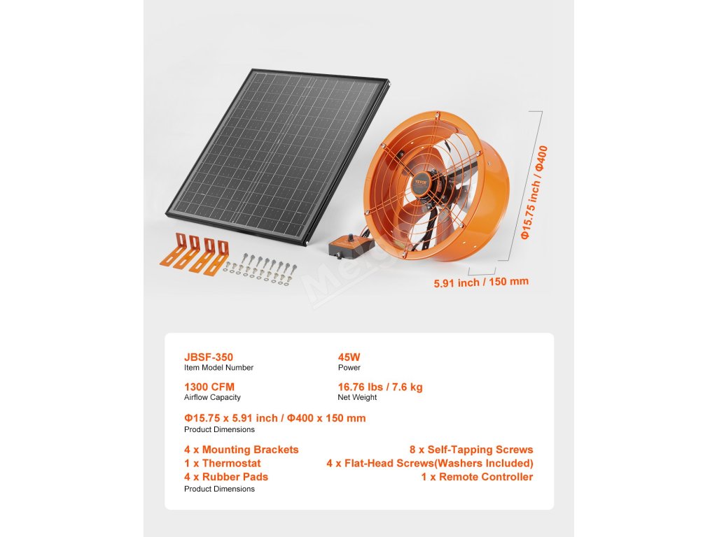 Solární ventilátor na štít 14 Inch, 1300 CFM, termostat, 1850 Sq.Ft